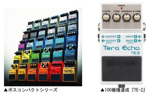 伝説的な1977年のOD-1発売以来、変わらぬ思想とデザインで、つねに時代に即応した独創的なニュー・エフェクトを続々と開発。ロック史を彩る数多くのベスト・セラー・モデルを輩出しています。BOSSが新たに提案する従来とはまったく違う新感覚の空間系エフェクト(新製品)TeraEchoの発売をもってコンパクトシリーズ100機種を達成しました!!