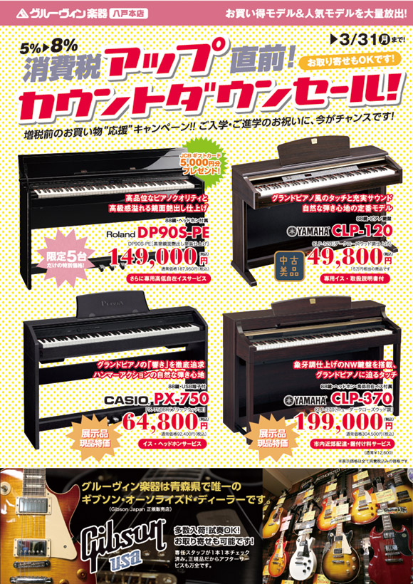 [八戸本店] 消費税5%→8%へのアップ直前の今、カウントダウンセールを開催! 電子ピアノ人気機種やお買い得モデルなど、今だけの価格でご提供。 増税前のお買い物“応援”キャンペーンです。(3月31日まで)